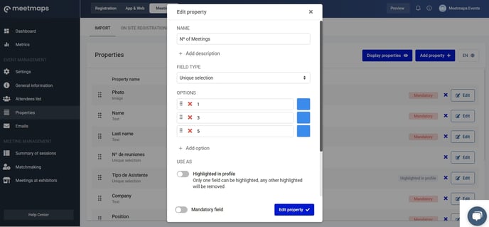 Manage properties from the Properties section, creating a numeric property with the maximum number of meetings.