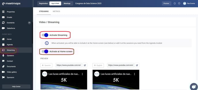 NOTA 🗒️: If you wish to transmit your streaming in more than one language🌐, your virtual event must also be configured in those languages (App, Web, Landing):