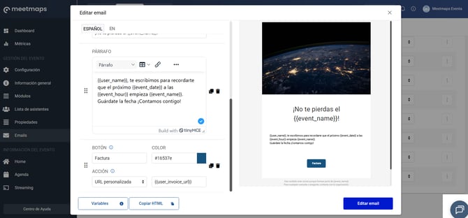 Al terminar de personalizar la plantilla haz click en “Editar email”. Esto asigna automáticamente el email a la acción de envío.