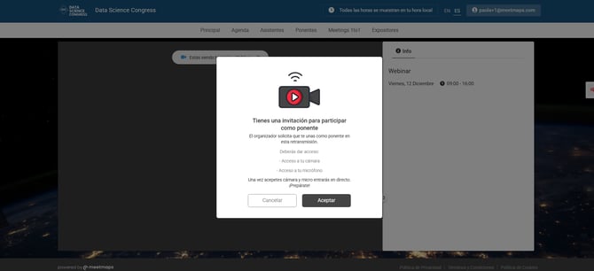 Si el asistente con estado registrado recibe una invitación para ser panelista de parte del moderador, puede aceptar o rechazarla.