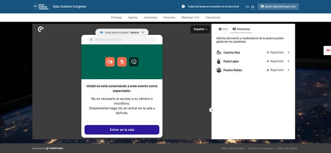 Al entrar como asistente registrado, se entra solo como “espectador”. No se puede habilitar cámara o micrófono.