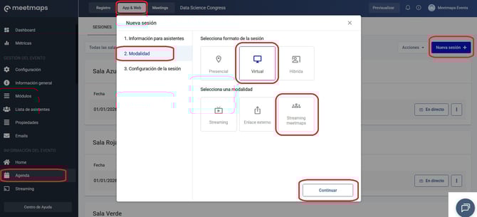 1. En App & Web > Agenda, crea una nueva sesión de agenda tipo estándar o de taller. En sección de 2.Modalidad, selecciona Virtual > Streaming Meetmaps